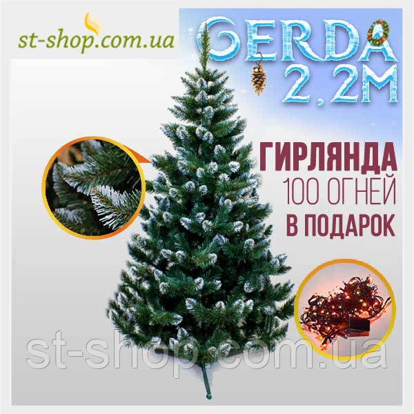 Ялина штучна з білими кінчиками "Герда" висота 2,2 метри. Новорічна штучна ялина виготовлена на металевій основі і встановлюється на міцність пластикова основа.